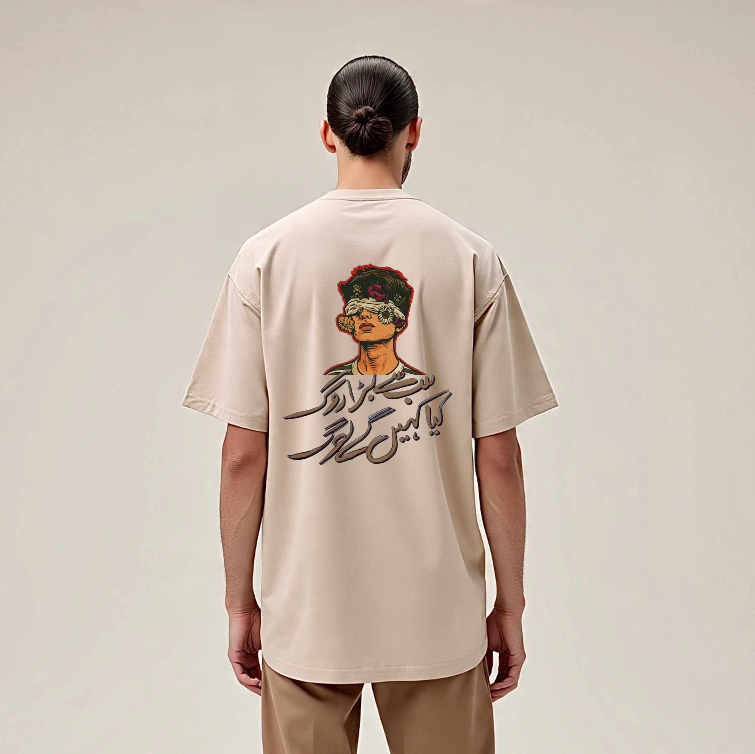 This t-shirt takes the basic tee and elevates it with an on-trend, voluminous silhouette. The signature drop shoulder and a deliberately oversized fit create a perfectly relaxed drape that feels modern and incredibly comfortable. It references the blindfolded figure and the floral elements.